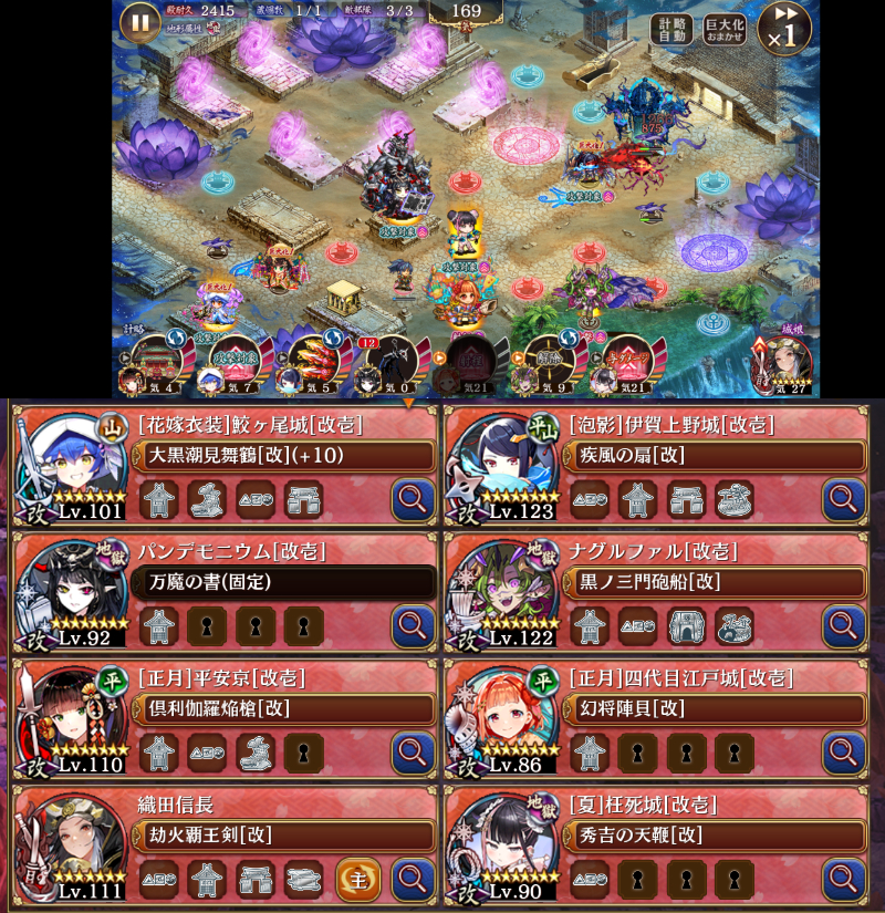 とりあえず楽したい人向け。巨大化するのはナグルファルと夏枉死だけ。あとは置いて嫁鮫の計略かけるだけ。平安だけ竜巻で死にそうなら巨大化回復するといいかも。ナグルはちょこちょこ移動はする