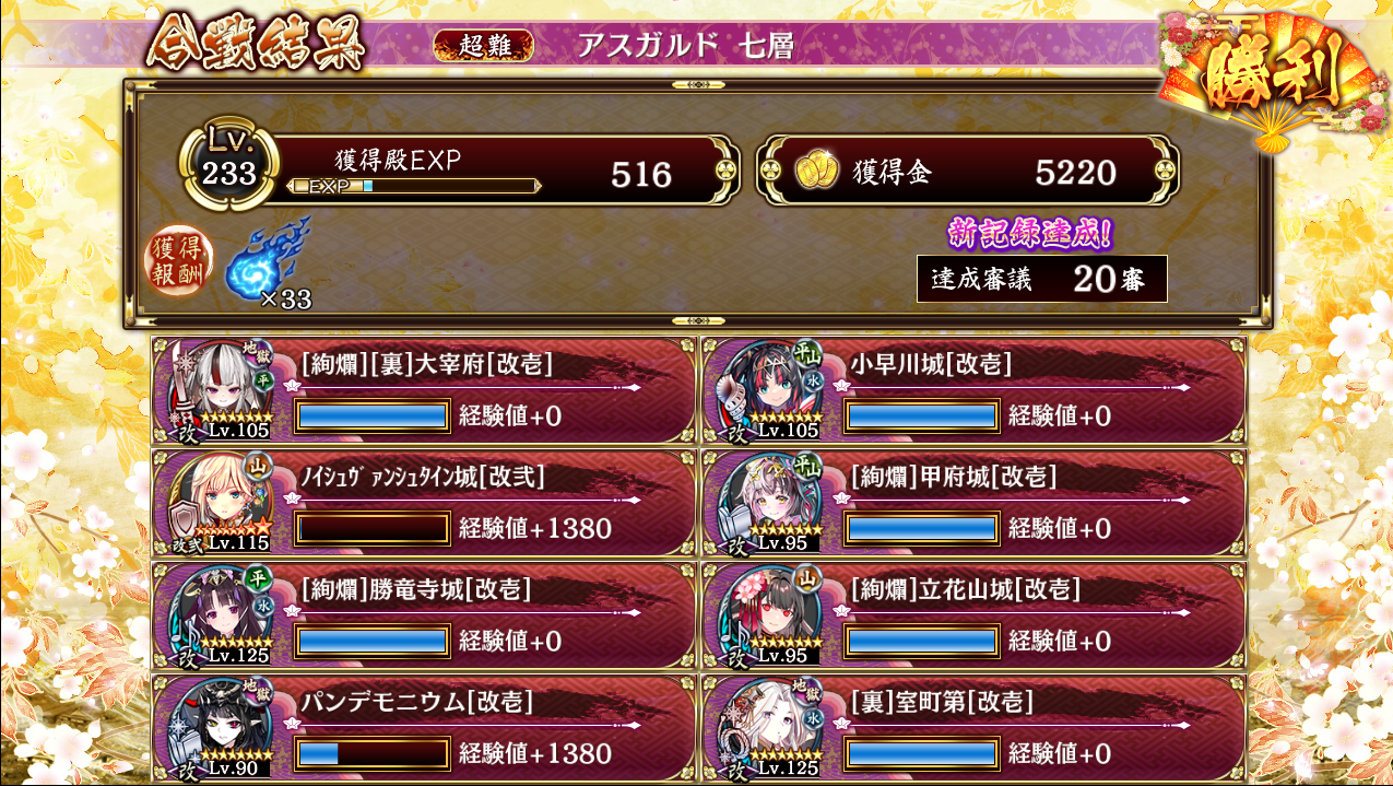 20審。パンデモニウムとノイシュ改弐のお陰。配置は9裏室町第、10絢爛甲府、16絢爛立花山、17パンデモニウム、18小早川、21ノイシュ改弐、22絢爛裏大宰府、23絢爛勝竜寺。甲府で軽減しつつ大宰府最大化、次に立花山を2~3巨大化(トゲにワンパンされるので)、左からのヘビに備えて室町第の強大化を進める。1と4にパンデモの堕天の使徒を置いて殴らせつつ特殊攻撃させると操作は忙しいが火力不足を補える。ヨルムンガルド出てからはどんどん使徒置いて特殊で削る。