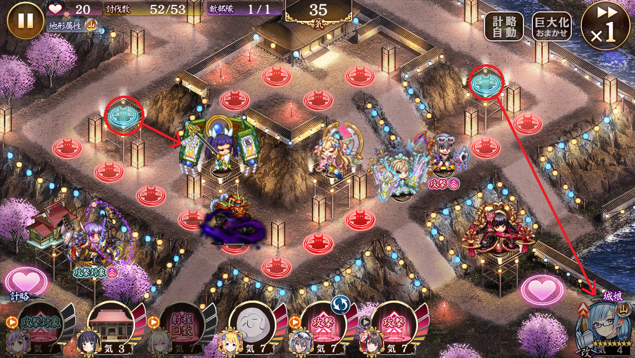 ポエが獅子+射程施設の1回巨大化で立花に届くので最大化、蜂は伏兵置いたら終盤まで撤退、高取の特技でファルケンの計略が左の赤備えに届くので中盤で気が貯まってから一気に最大化、カルルは最後の騎馬が来たら撤退。適宜カルル計略で気を稼げばなんとかなった。