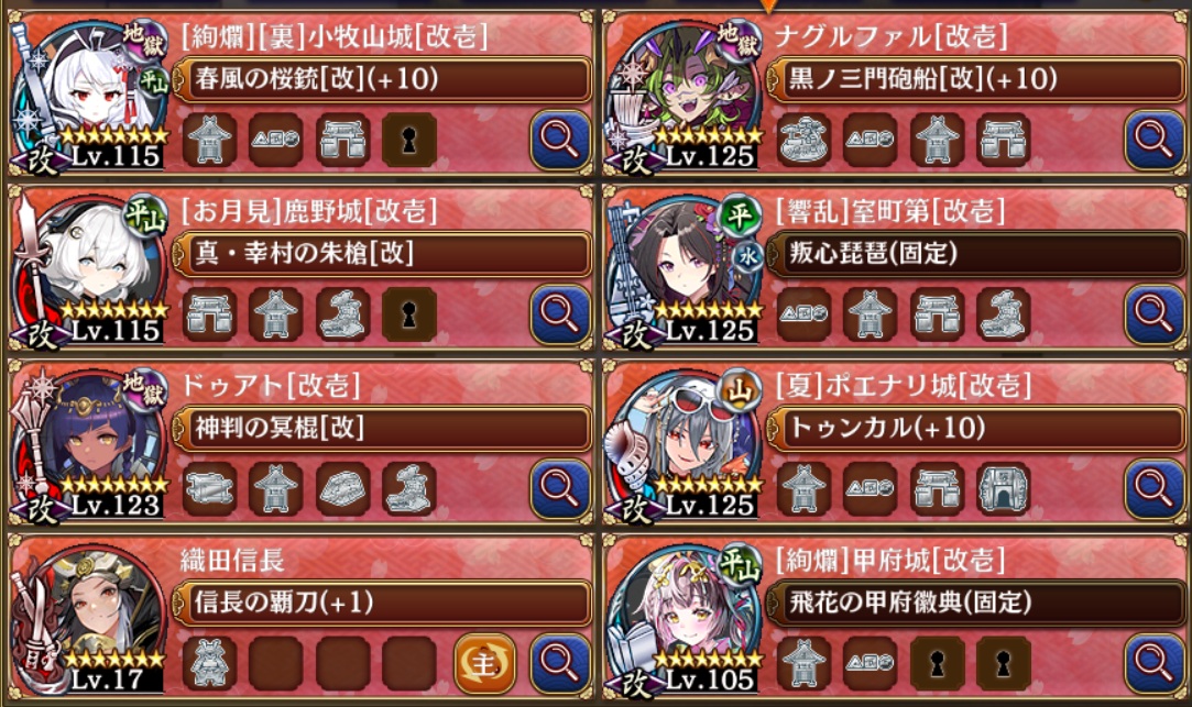 ここを参考に30審クリア時の編成。計略が途切れてないのに異伝室町が二段階目のヘルに倒されることがあったりなかったりしたが、最終的に左上に置いた夏ポエのトークンのノックバックが決め手だった。
