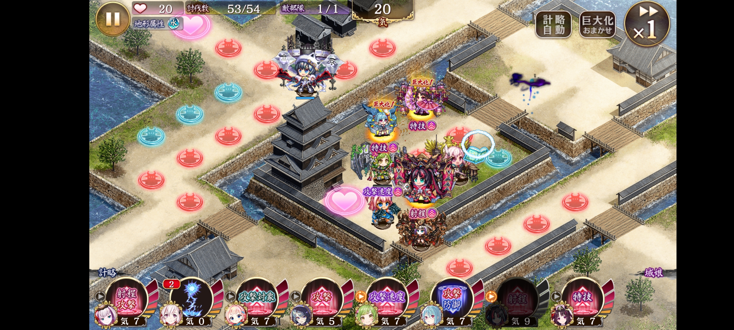 初回計略短縮施設積みまくった勝竜寺即置き、裏坂本は21→天一閣特技発動と同時に22に甘崎城置いて最大化。出来たら裏坂本12に置いて玉藻最大化。画像は最後のボスにアラゴ21裏坂本27に置いたけど別にやらんでもよさげ。甘崎改弐が使えて嬉しい