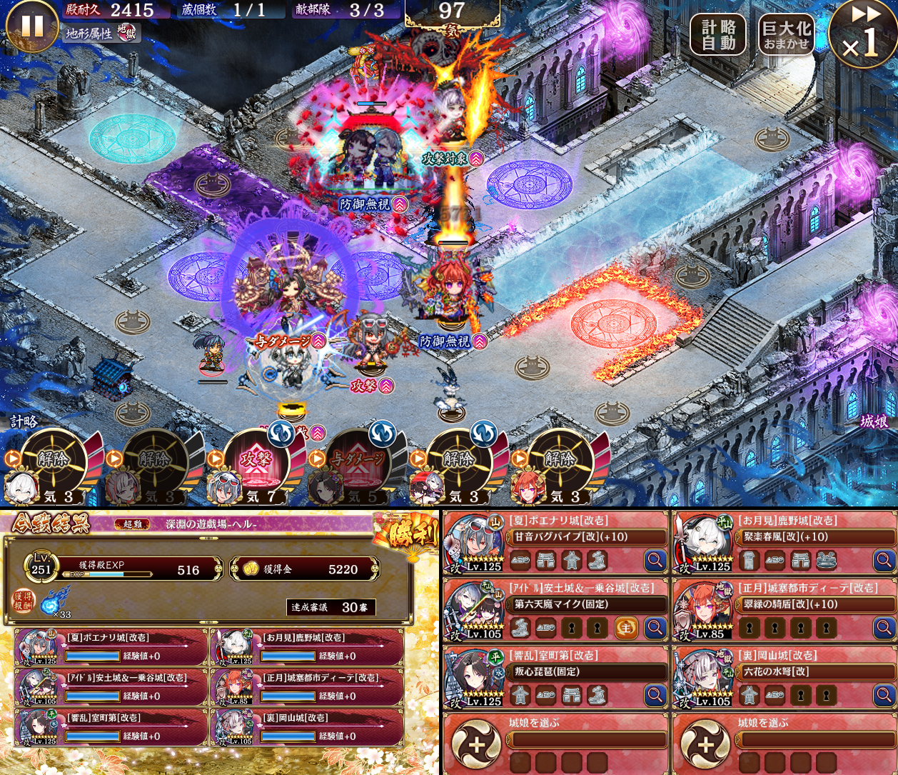 30審アイドル安土一乗谷。クリンタ枉死と同様に5人でヘルまでいけるけど、こちらの場合は途中で射程減が効かなくなって全体ダメージを食らって壊滅するので、火力役を足して処理