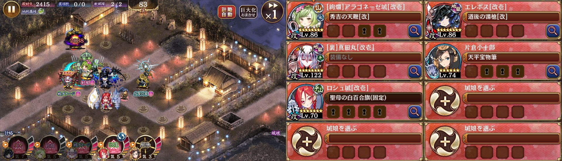 5人編成。ロシュの回復計略で支えつつ絢爛アラゴで殲滅。裏真田丸は最後まで巨大化なしで耐えられる。
