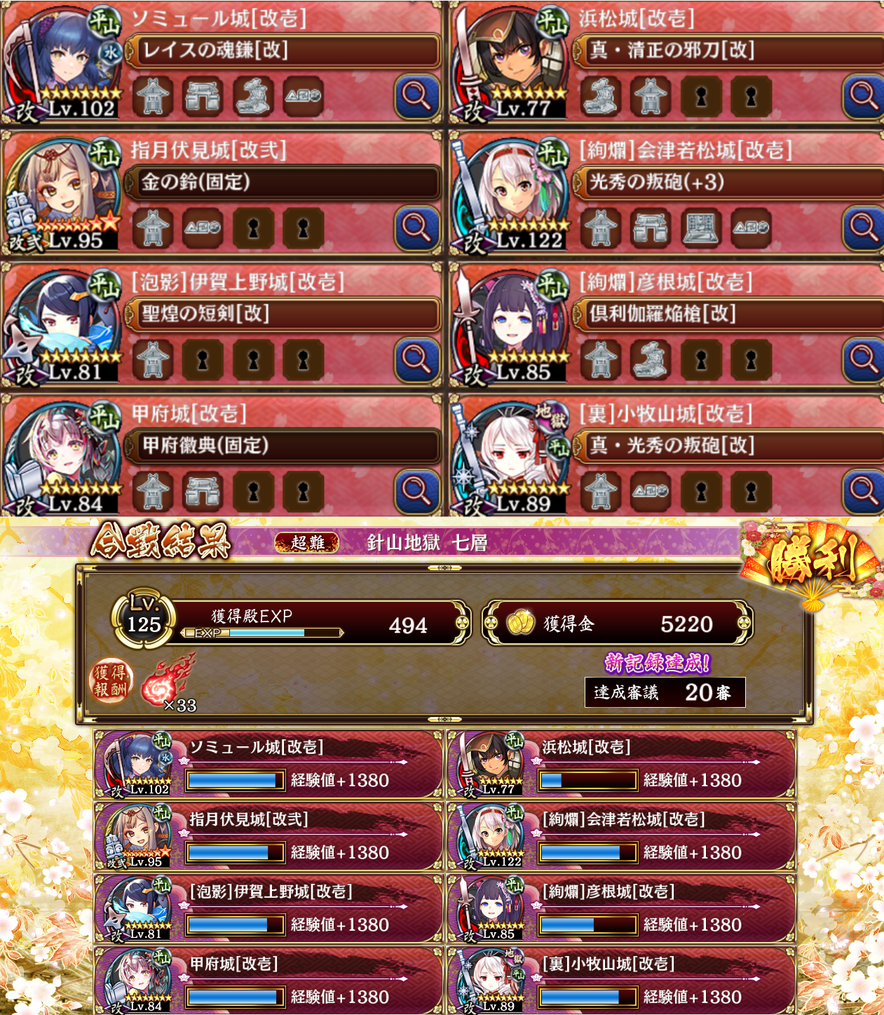 20審クリア。泡影伊賀上野無双でした。指月伏見が倒されると毛利バリアが抜けなくなるのでソミュールで拘束、浜松甲府を囮にして指月伏見に攻撃が来る前に倒すように調整しました