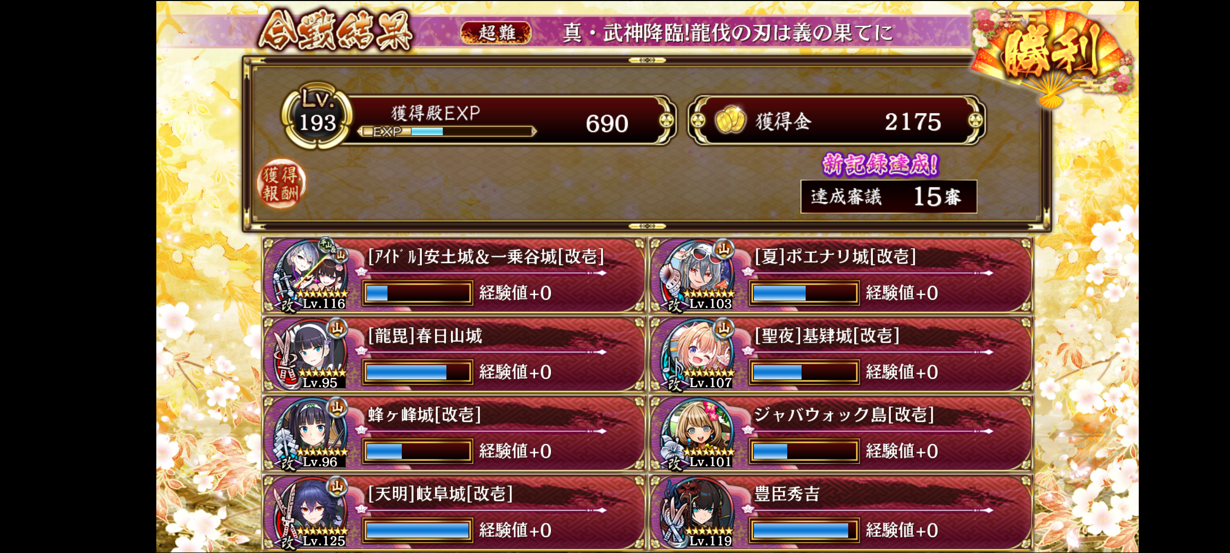 とりあえず容赦ない布陣で15審議。誰を謙信の避雷針にするかと、どう気を稼ぐかっていうマップ。殿の腕次第だと思うけど、祓串で豪雷を無効化した方が安定すると思う。飛行敵の対応にアズイチの計略2+異伝岐阜が刺さった。