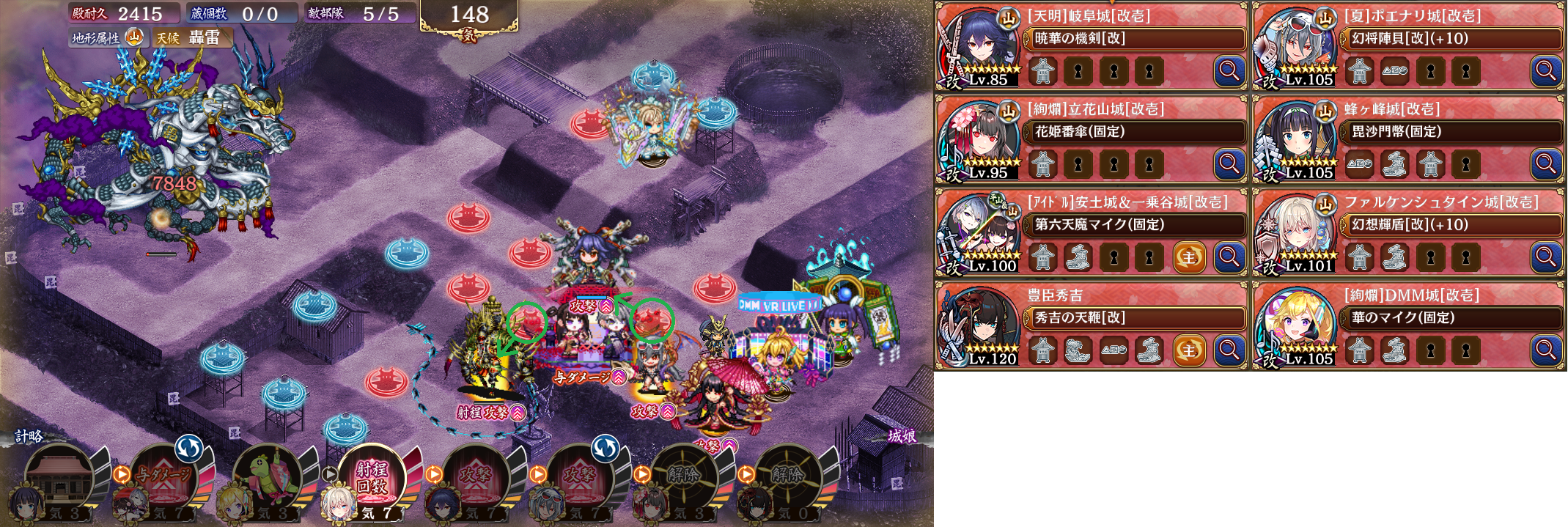 無属性混合15審 序盤凌いだらタイミング見計らって岐阜を移動、DMMを出し入れして秀吉の火力を上げたら、3Wに敵が落ち着くタイミングがあるので秀吉を画像位置に移動して上杉の攻撃を単体で受けるようにした。