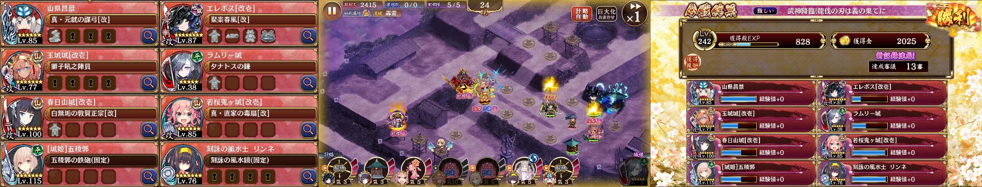 13審。配布7人(含コラボ)+若桜。開幕は11山県、14玉城、18エレボス、26春日山、13ラムリー配置し、即エレボス最大化して山県計略発動までラムリーで時間稼ぎ。ボスはエレボスを3に移動し、トークン空蝉とちび若桜で時間を稼ぐ。倒したらエレボスはすぐ右下のフォローに入る。エレボスは3でデバフと山県へのCT短縮を両立させるために要射程480。