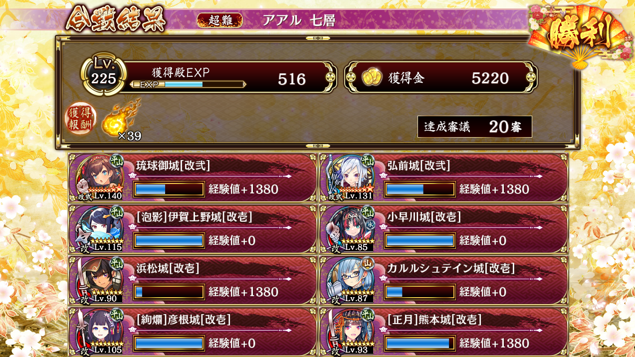 15に伊賀上野、23に琉球、他正月熊本以外を右下に適当に固めて置く。浜松計略で絢爛彦根の特技発動。最初は伊賀上野を最大化するほど気がないので小早川の計略ON。後はねぷた祭りとシーサーしながら最大化していって浜松を正月熊本と入れ替え、北条が出てきたら正月熊本の計略でまとめて隠密。大破上等なら正月熊本は不要。理屈では敵忍者は伏兵で隠密解除できるし長射程高火力を15に置いて23に北条を早くぶっ飛ばせるキャラ置ければなんでもいいんだが、そんなキャラ限定と改弐以外でいなさそう