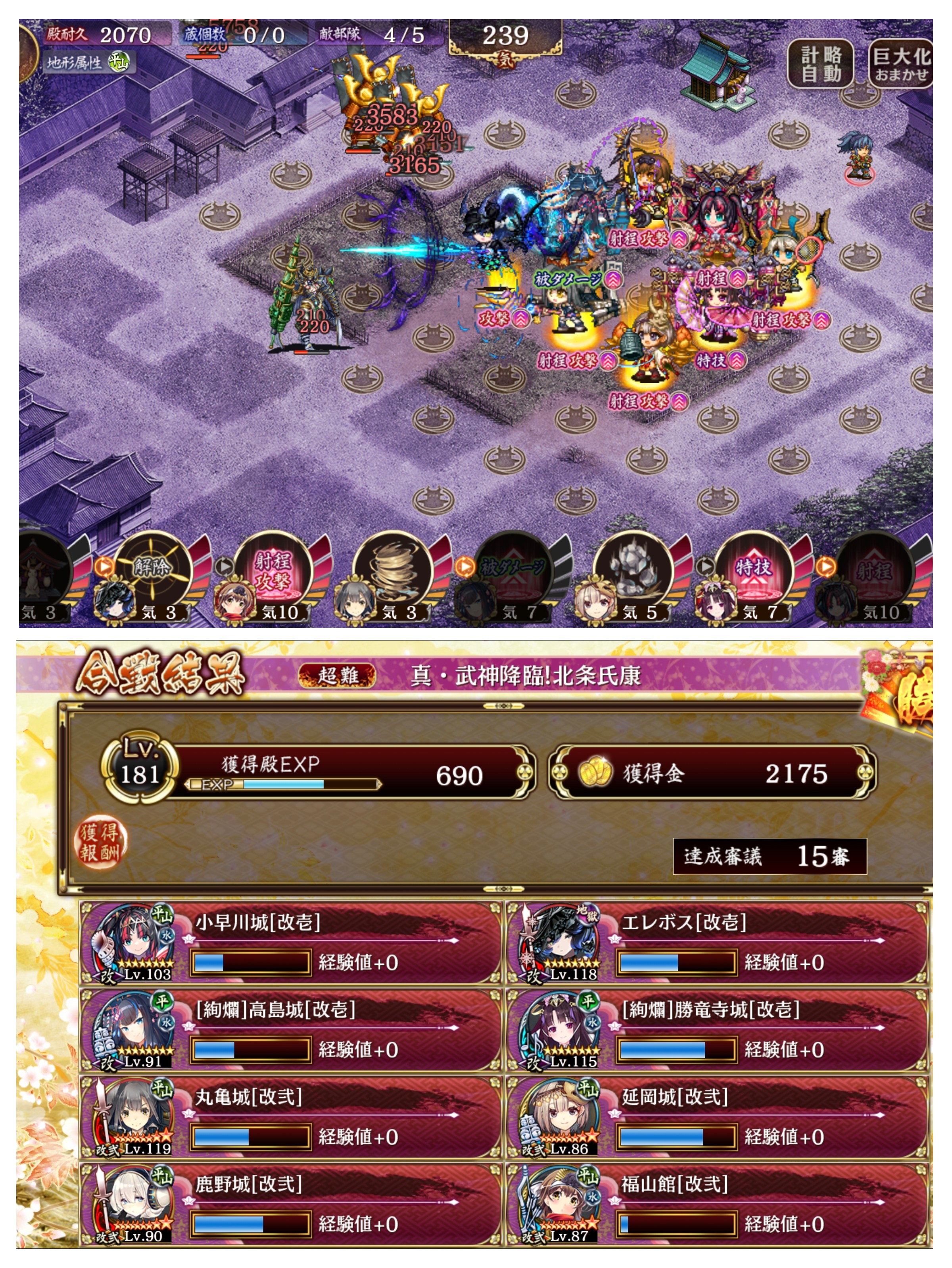 入手しやすい城娘だけでも15審クリアできた。ボスの攻撃は鹿野城で耐久を増やした絢爛高島と絢爛勝竜寺で受けた。計略再使用時間短縮が足りないから、福山館は絢爛弘前城か弘前城に変えたほうが安定しそう。