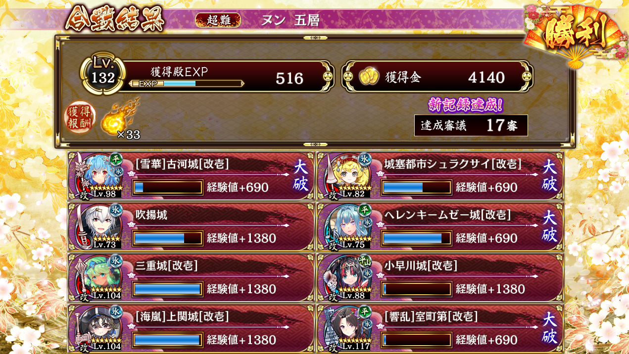 17審。みんなの攻略編成見るとアタッカー良いの使ってますね。どれも持ってないので手持ちの[海嵐]上関、[雪華]古河、シュラクサイの3枚で明智殴って頑張りました。開幕14にシュラクサイ、7に吹揚配置でシュラクサイ最大化して吹揚の伏兵も配置。18にヘレン、15に三重配置。回復体制整えながら21に室町、12に小早川で地盤固め。11に古河、10に上関で布陣完成。後半反射でボロボロだったけど粘り勝ち。縛りきつくて手持ち少ないと苦しい。水単の強力なアタッカーとダメ軽減出来る回復役が必須。小早川居ると後半の殲滅力高い。