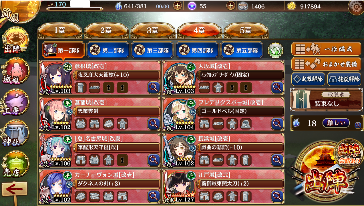 木主です。やっぱTD向いてないですねw攻略動画見て編成と同じ城娘を揃えることを「持ち物検査」配置と巨大化やデコイ置くタイミングを模倣することを「トレース」と表現しました。実際全員揃えるのは無理で5人くらい揃えればOKで後は代用してます。トレースは配置だけ重視して後はメンドイので高レアの暴力で誤魔化してました。皆さんのコメおかげでモチベ上がって私らしく高レア暴力で55話委任開放で4章クリアできました。ただ過去イチ不快マップでやっぱ全然おもんないwしばらく休みます。皆さんありがとうございました。あと編成はこんなでした。