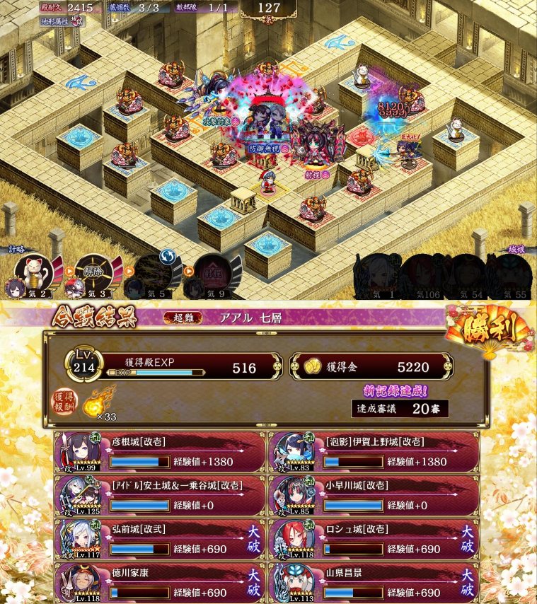 徳川入手し行けるじゃろと20審。徳川、山県、小早川が不屈で北条初撃耐える…つもりが継続ダメを若干支え切れず終盤崩壊。がしかし、崩壊したままクリアできたからヨシ!初動+CT増+隠密+気不足が辛いマップだったけど徳川でなんとかなった