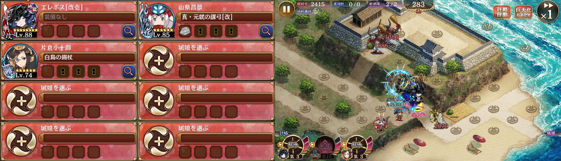 ガチャなし3人全自動。21片倉、17山県、24エレボスを配置後、計略自動・巨大化おまかせをセットして終了。水牛兜を倒すと攻撃力6600くらいの反撃が飛んでくるので、施設と装備で山県の耐久を上げて一撃死しないようにする