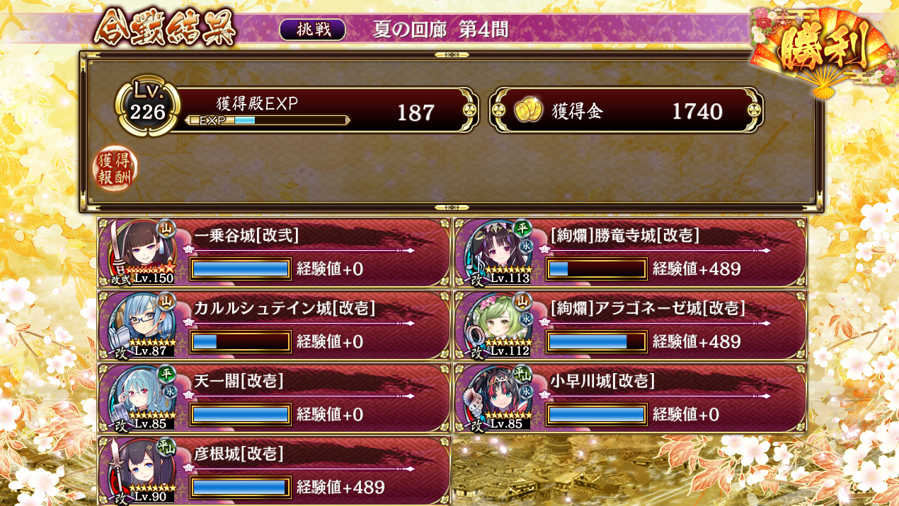 もう少し編成ハードル下げてみた。カルルは天一が無凸で最初のダッシュに計略が間に合わないから入れてるだけなので天一が凸できてて鯱装備できるなら入れなくていいかも。一乗谷がとにかく最優先
