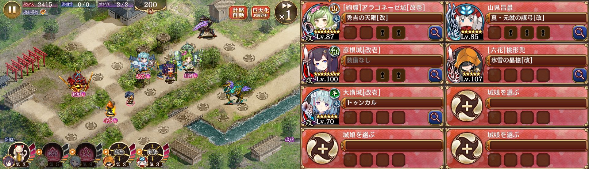 5人編成。最初から全員配置(6山県、17大溝、23彦根、28絢爛アラゴ、10六花桃形)し、気トークンを置きつつ桃形、彦根、絢爛アラゴを最大化。その後は静観し、気が60以上貯まったら全自動計略と巨大化おまかせをセットして獅子を片付ける。2Wに入ったら麒麟のデコイ用に25に気トークンを置いて終了