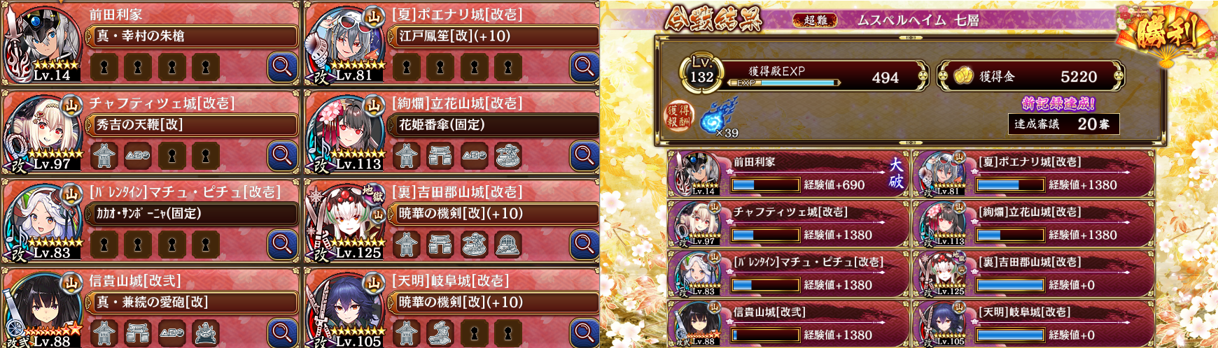 20審クリアしました。今夏まで温めておいた千狐玉で夏ポエナリ城をお迎え。強い。あとしぎー改弐のお陰で高虎君の極悪マルチ攻撃を防げたの大きい。なんなら最後のラッシュででかいのを食い止めたり火力の底上げにも役に立ちました。ありがとしぎー