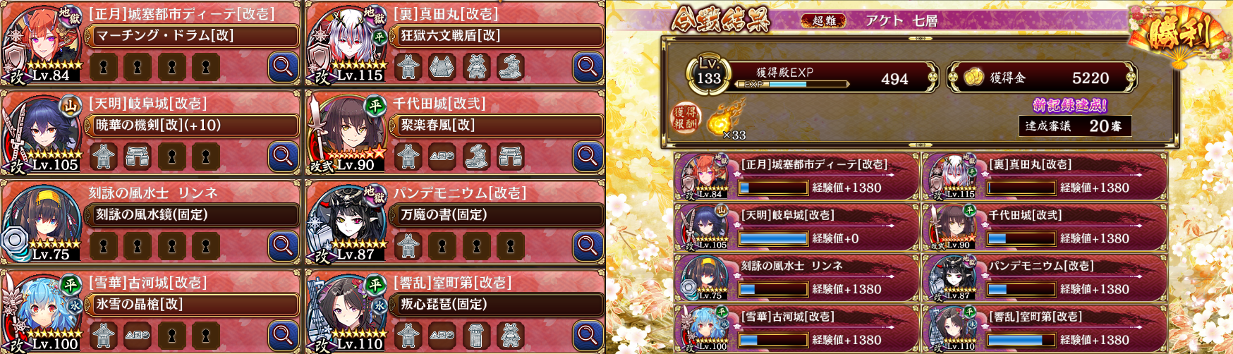 20審クリアしました。千代田改弐の鷹がホルスにぶっ刺さって無事突破。巨大メジェドラッシュは正月ディーテとパンデモニウムの伏兵が壁になって耐え、コンスは裏真田丸で抑えました。鏡君相手に雪華古河が反射する際に生き残るよう調整するのがちょっと手間取ってしまった