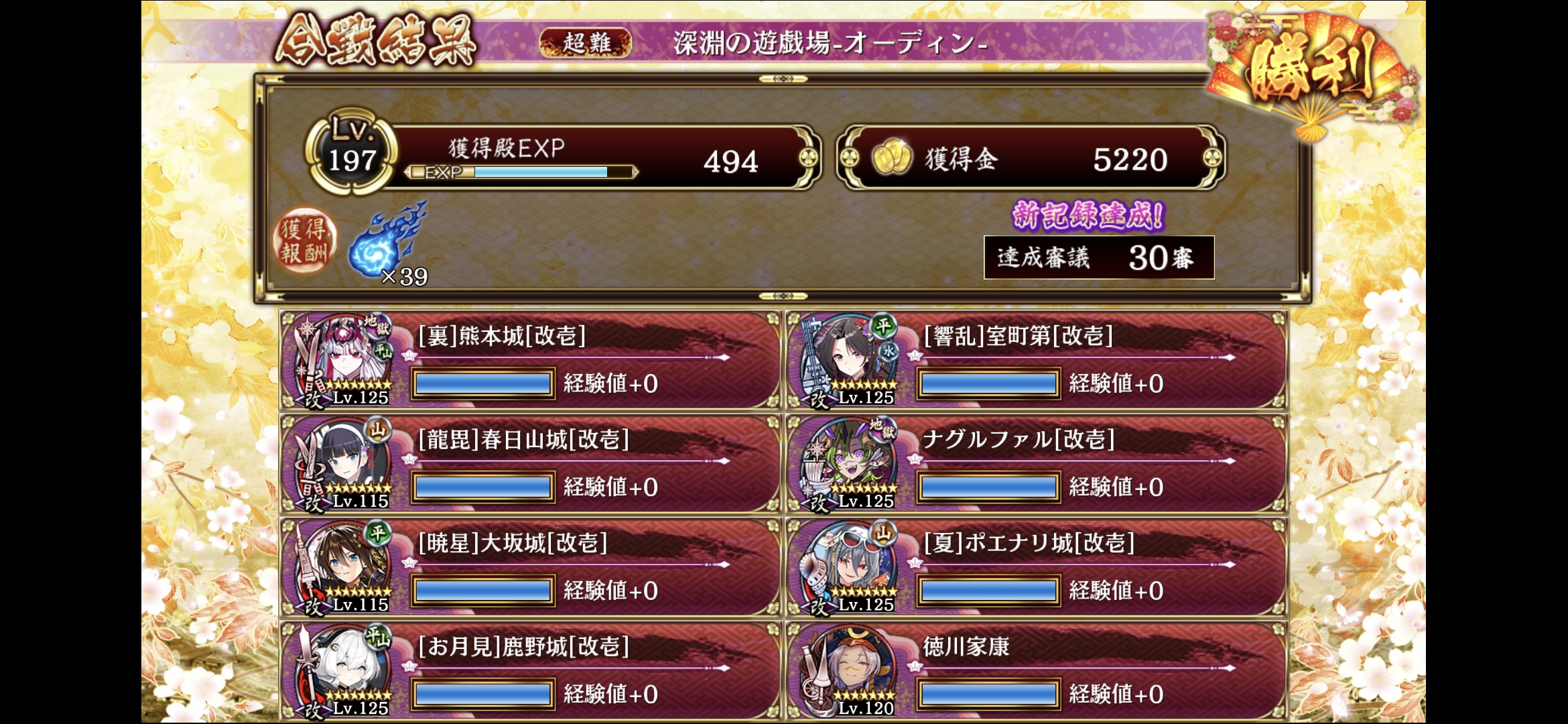 裏熊本を使いたくて試行錯誤の末の30審。左からの攻撃は異伝大坂があっち行きこっち行きして足止め。オーディンの攻撃は異伝春日山と家康で完封。序盤〜中盤はとにかく操作が忙しかった。オーディン倒した後の盾兵は裏熊本の計略でぼ~っと待つだけ。少人数で攻略してる人すげーわ。