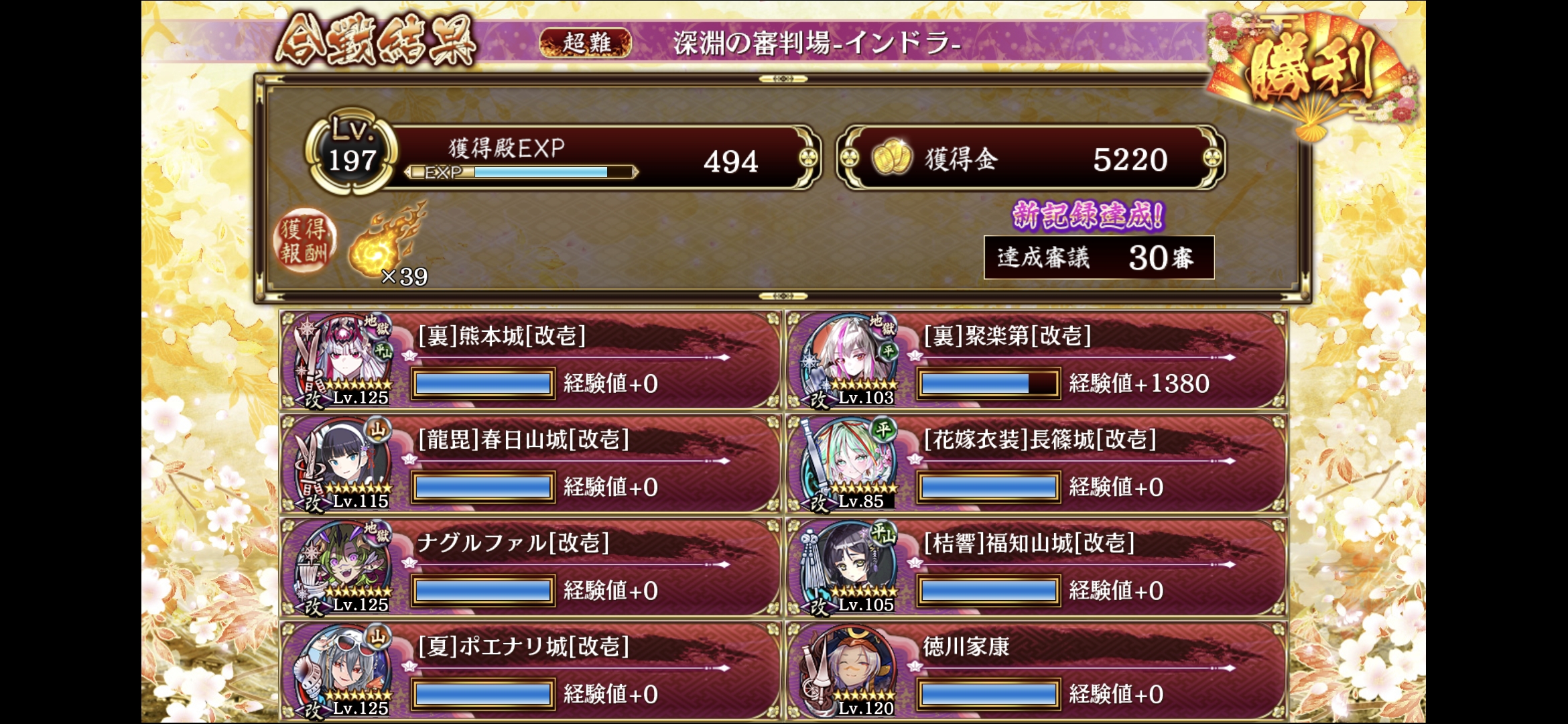 30審。裏聚楽が相当利いた。インドラの攻撃に苦戦していたが、配置を見直したら封印に成功。終盤はほぼ放置。