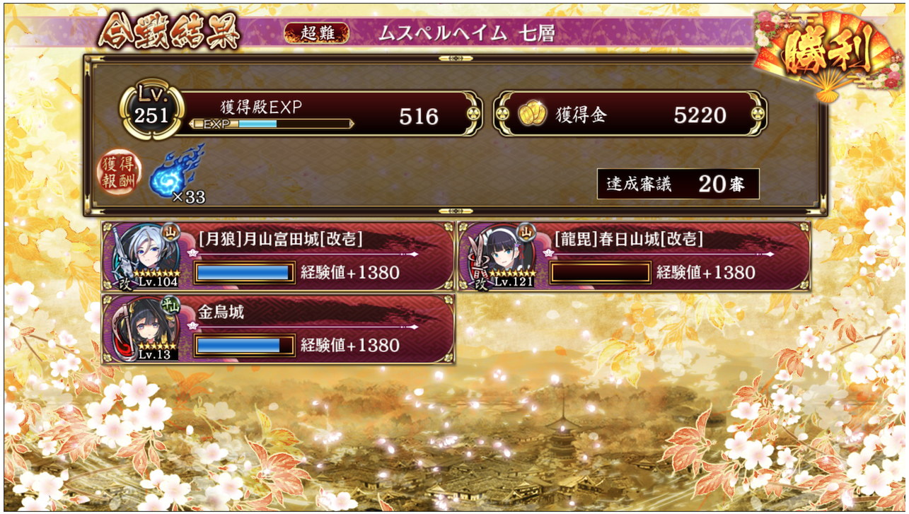 18月山富田城。審議の関係で高虎以外に月山富田が落とされる事はないのでムスペル倒すまで最大化だけで問題なし。雑魚を全て毒で倒して後は高虎を計略のバリアが切れる前に倒せば勝ち。