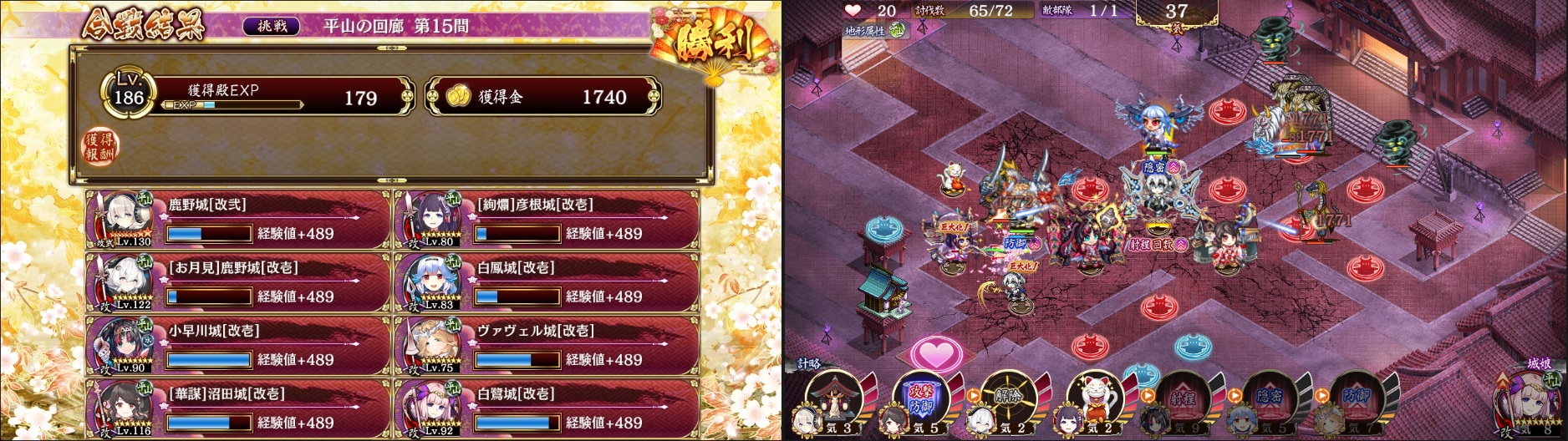 参考になるかわからないけど貼っておきます。月見鹿野いるけど浜松なんていない人向け。白鷺城の役割は最後のラッシュを大破特技で一時足止めさせるため。マジムンが25に来たら25に配置。大破後に月見鹿野、白鳳、華謀沼田で集中攻撃。白鳳は戦刃のナイフ、華謀沼田は冥界の儀杖装備。最大化順は月見鹿野→華謀沼田→白鳳→ヴァヴェル。絢爛彦根の最大化は間に合わない。あと絢爛彦根の伏兵は一度置き換え。①23②21③4(23消滅)。③は牛頭が出てくる直前に配置。計略は月見鹿野を開始直後に自動ONにする以外は他キャラは最後のラッシュまで使わない。ちなみに画像右側は25に白鷺置いたところをスクショ撮ろうとしたら失敗しました。
