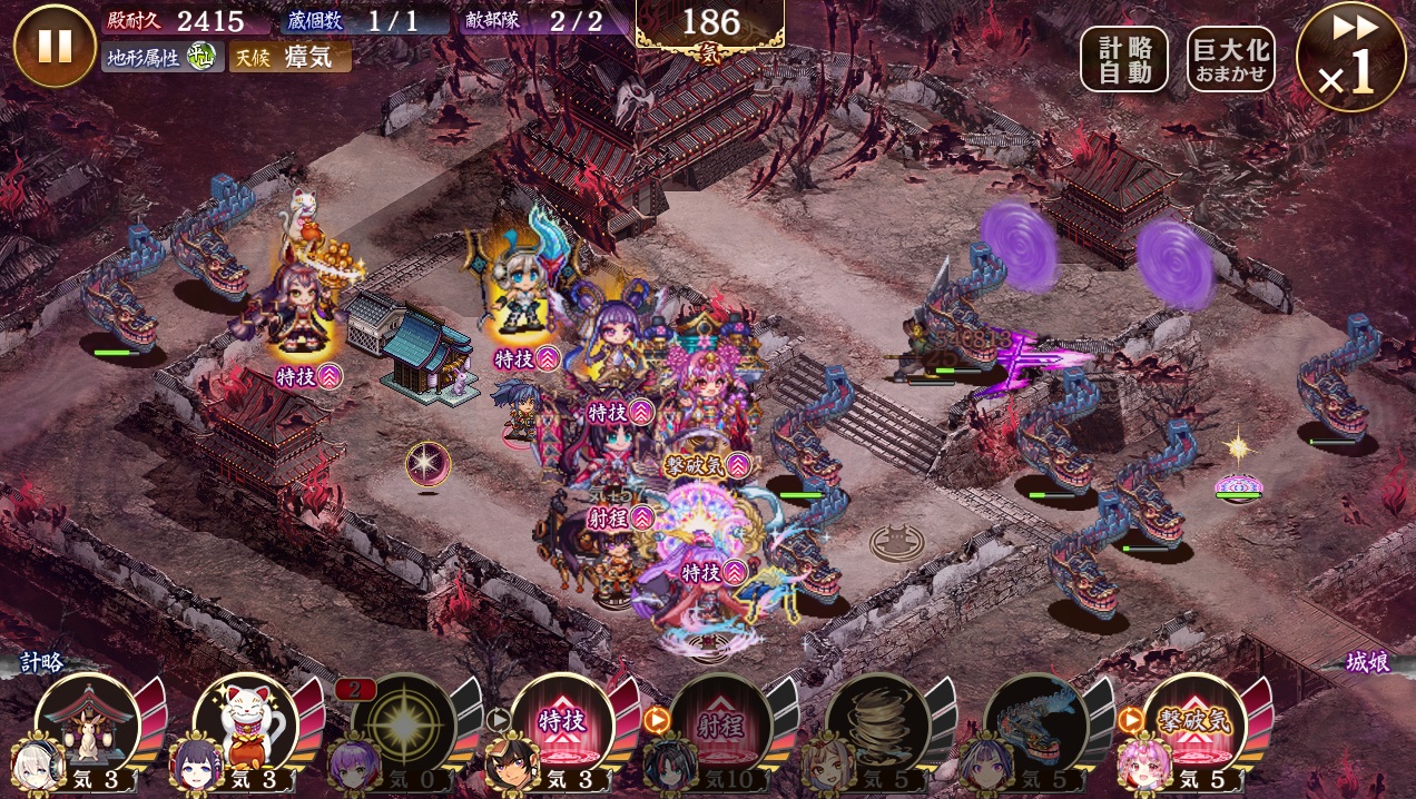 令和最新版が居ないのでこんな感じで、瘴気を踏み倒しながら指月の敵射程ダウンでA蔵を守るスタイル。万里のトークン頼り