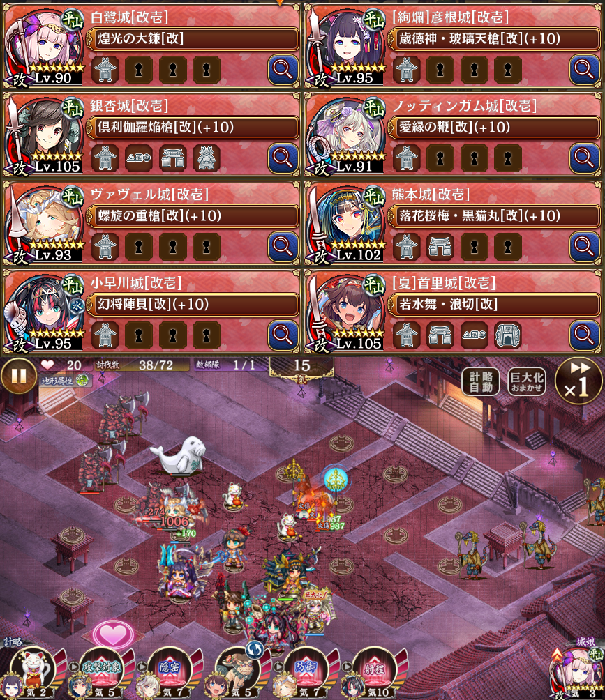 限定城娘が足りない復帰殿ですが、超ギリギリ大破祭りで挑戦クリアできました。参考までに。愛縁の鞭の射程デバフのおかげでノッティンガムが生き残れます。左の鬼武士2体を処理し終わって、中央の大破が始まったら、最後の最後に左下で白鷺を巨大化しましょう。