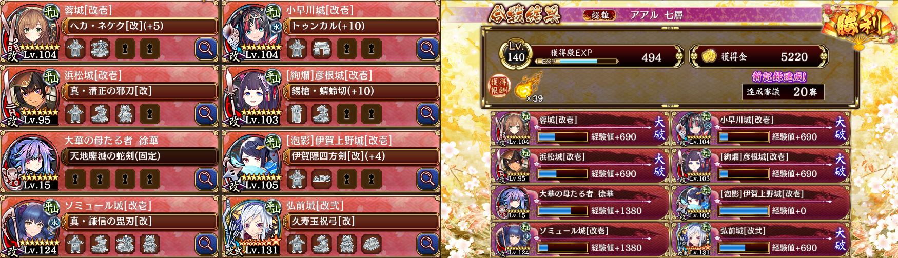 竜神像解禁して20審クリア…適宜徐華とソミュール城を使って耐えられないところを耐えて泡影伊賀上野城で削りながら山車を守る戦法でした。終盤はなんかこうイイ感じになって銀水牛脇立形から蔵を守り切れば、武神北条は徐華をぶつけるだけで終わった