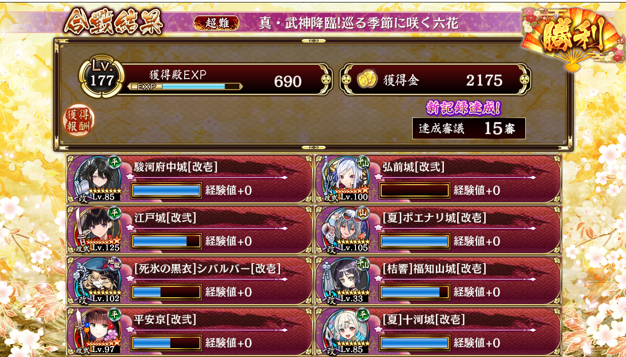 駿河府中城の可能性を探ってたらそのまま行ってもうた、多賀がついに外れたのと気づいたら水一人もいなかった…黒シバのキャラパワーごり押しなんだけど繋いだ駿河府中もよかった