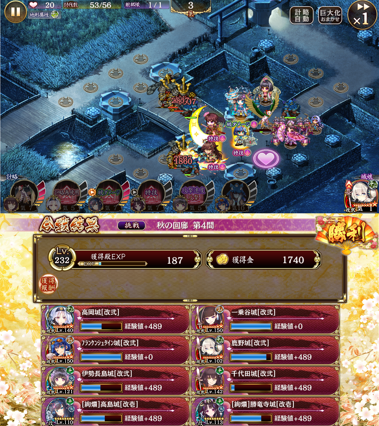 配布と恒常の星6以下でクリア。俺の頭ではこれが限界だった。フランと一条谷に勝竜計略かけるんだけど高岡いないと間に合わない。千代田は鷹出したら一旦引っ込める。フランは最終的に巨大化3回しかしてないが勝竜計略で特技発動してたら伏兵が堅いのなんの
