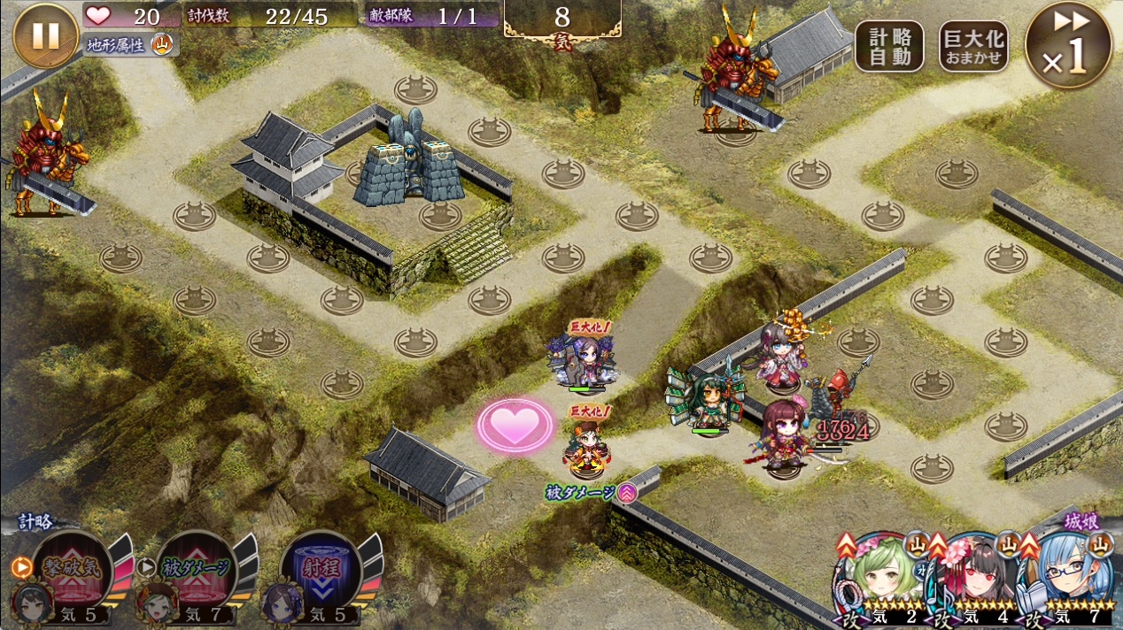 一応無課金で手に入るキャラで初動をしのぐところまではやってみた。ただしかなりギリギリで装備は足止め重視、絢爛七尾は二凸で一条改弐は150まで上げてる。これでとりあえず上の騎馬が動き出すまではしのげた。ニッカナを三回巨大化して後は撃破されないように巨大化していく