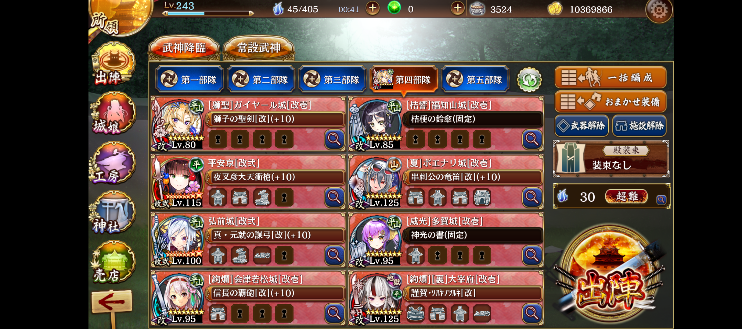 ギリギリで気審議外して13審。鉄砲はほぼ戦力にならないし最後のラッシュで大破するからデバフ機能付きとかのほうがいいのかもしれない。手持ちじゃ15は遥か遠いわ
