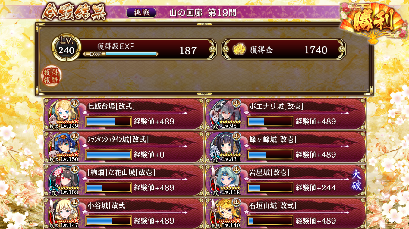 限定が絢爛立花だけでクリア。油断して岩屋が大破したのと蜂ヶ峰が無凸なのできつかった。絢爛立花もなしで行きたかったが蜂ヶ峰がある程度凸してないと気が足りない