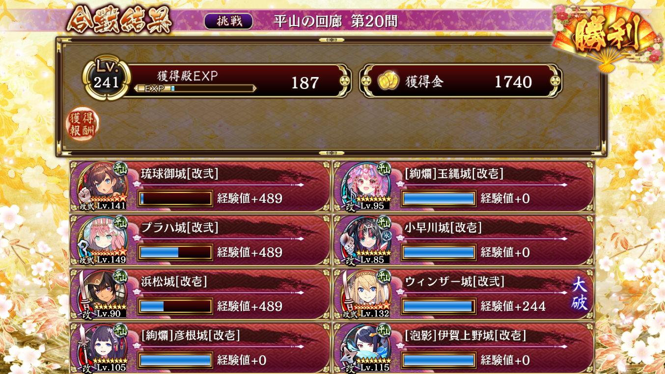 やはり暴力…暴力は全てを解決する。浜松で13に置いた琉球の特技を発動して序盤は殴り飛ばした。琉球より先に玉縄を巨大化したら安定した。伊賀上野は最初特殊能力を使ったらすぐひっこめたがプラハ使わずそのまま伊賀上野を上の方に置いて巨大化すればよかったんじゃないかって気がしてきた。浜松の初計を極力短縮して二度目の計略を絢爛彦根にかけたけどギリギリだったから施設がなければプラハ抜いて異伝加賀か伏見改二入れてもいいかな