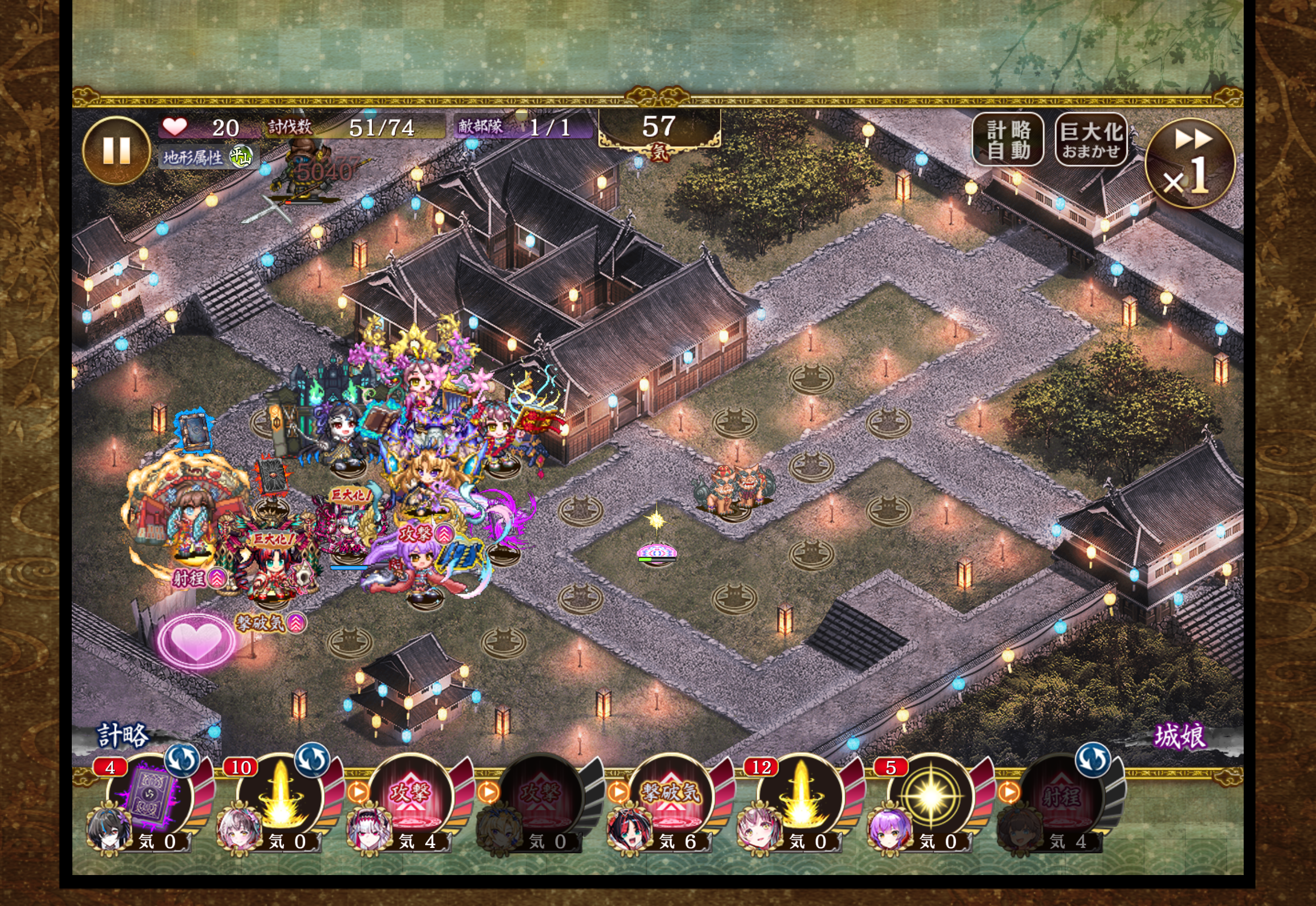 レア度と配置気軽減と本優遇マップの暴力。9裏熊本→14異伝多賀→8ミスカトニック→12絢爛甲府→16甲府→13ガイヤール、を初手で配置。最速で4威光、1ナコトを置いた上で、ガイヤール特殊発動、裏熊本特技発動、ナムナムx2でラッシュを乗り切る。あとは2異伝首里、6正月小早川で盤面固めてバフ盛り盛りのガイヤール無双させるだけ。全員に配置気軽減はつけてる。