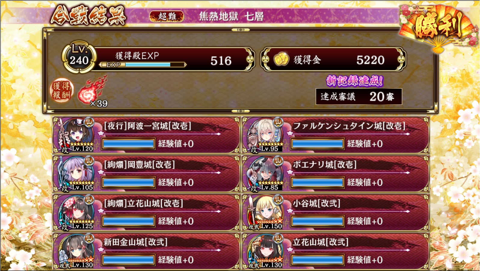 20審議 夏ポエ無し 改弐や異伝だけど☆6以下が4体 小谷城と阿波一宮城がMVP、トッシー処理は10ファルケン、小谷改弐が性能も撃破気も優秀、妖怪処理は17阿波一宮でサクサク処理してくれる。