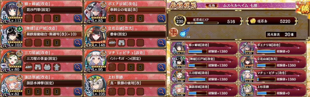 [[立ち上がり>https://uploader.swiki.jp/attachment/full/attachment_hash/694c09653ac1f45ece668054f26684a070700e4f]]、[[ボス>https://uploader.swiki.jp/attachment/full/attachment_hash/4549edbe1fd43091b05dcbf652b4b79f0f0107df]]。マス移動は回復を何体か最大化させた頃に。今だと絢爛立花山より立花山改二の方が回復高いので、大破するようなら入れ替え候補(回復役は回復力あるなら誰でも)。さらに念のためポエナリ武器も吸血陣貝に。GIFではボス出現させるタイミングがいまいちだけど問題はなかった