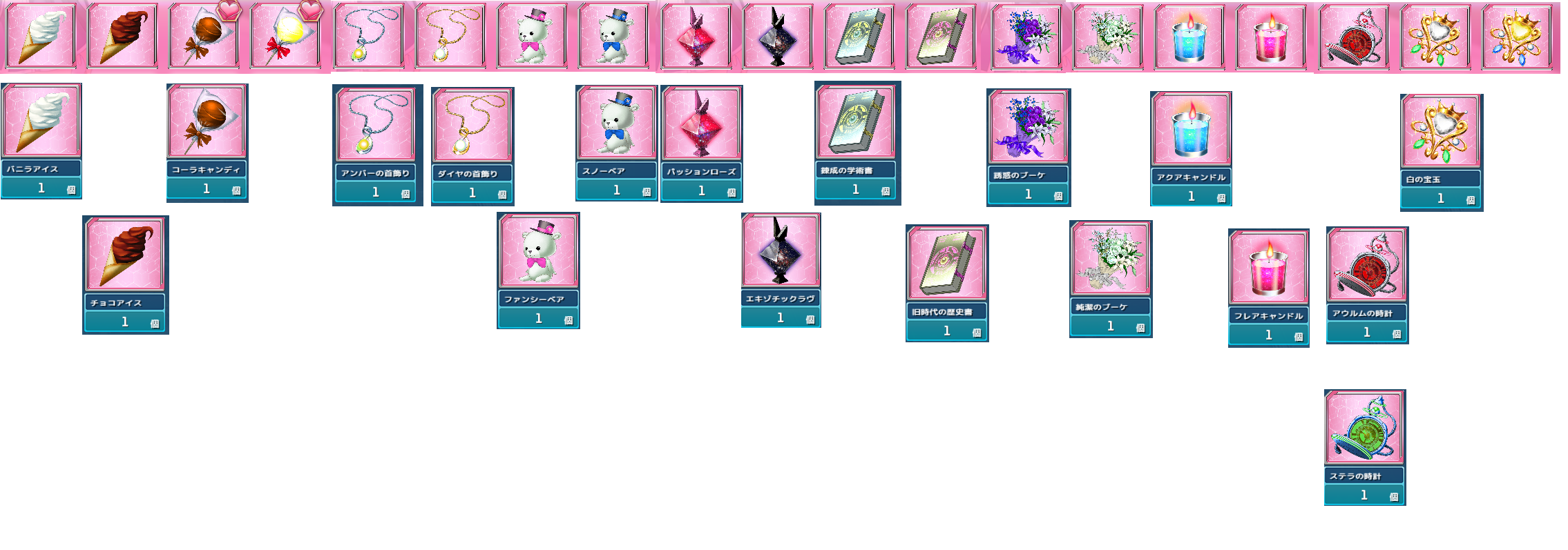 好感度アイテム 二つ名称不明 贈り物画面とドロップ画面とで画像を切り貼りしています