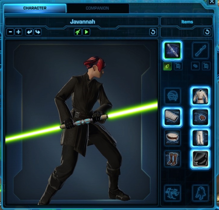 最近追加されたオビワンっぽい装備を黒染料で染めたら、アナキン風かと思いきや、ダースモールになりました。