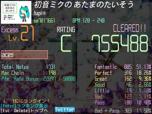 ''初音ミクのあたまのたいそうEx、人類未踏Rank C陥落!!!!!!!!!!!''