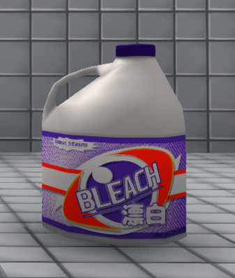 他の操作(OpenやWearなど)が表示されていないときに、E(Sweep)長押しで使えます。E(Dip In Bucket First!)となっている場合、まずモップを漂白剤(Bleach)入りの水に浸す必要があります。トイレの水道でバケツに水を汲み、近くにある漂白剤(画像のやつです)を持ちバケツの前でE(Pour Bleach)を押し、最後にモップを持ってE(Dip)かR(Dip)で浸せばokです。